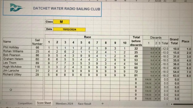 Nice turnout on Sunday, eight boats ! Especially as the severe weather warning for rain only ceased at 9am!! Pretty light winds, but Phil properly cleaned up with Rohan a great second!!