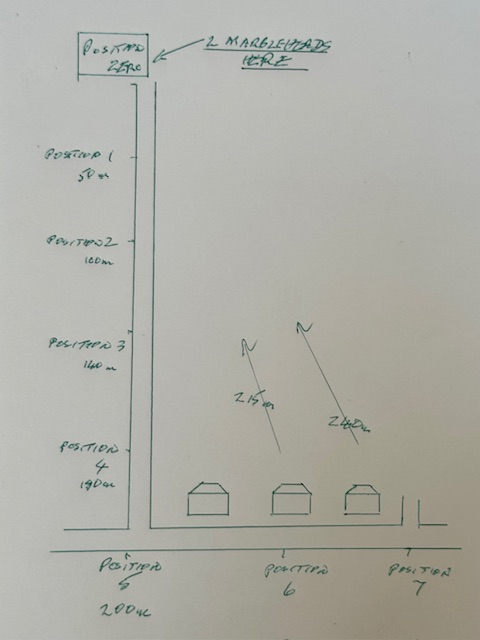 We sail on dead flat reservoir water, so with a solid surface beneath us, not free sky. Clear line of sight to the boats, no obstructions. Today’s tests, Positions 0-5, were similar really – carried out on a dead flat street, 200metres long, with line of sight to the boats. Then the next two measurement points I had to turn 90 degrees at the the road junction and walk along that street (measurement points 6 and 7). Measurement points 6 and 7 therefore lost line of sight, and gained a couple of houses in the way of the signal…. they were quickly more challenging to the radio, but I wanted to see which brand gave up first, and was it actually a “close thing”?? Measurements stated for position 6 and 7 were direct back to position 0, as the bird flies.