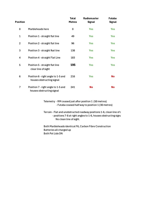 2. Radiomaster lasted maybe 10% further (20m) than the Futaba.