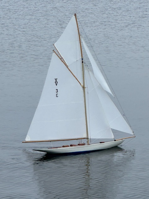 The second boat was a converted Vane Ten Rater built to the old rule. That’s the one that stole my heart today – a gorgeous complete rebuild and running on radio now. Stunning and a whopping size. Stupidly I didn’t get photos of that as I had my IOM on the water on “rescue” duty in case we lost the gaff cutter … which happened a few times on saturday!! A small matter if the mainsheet not staying on the winch drum as intended!!