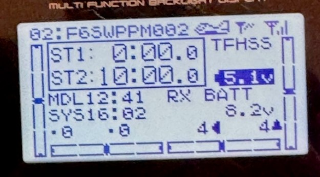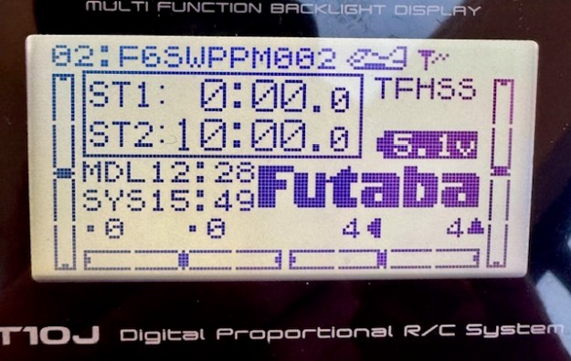 What I am talking about is the missing data in that photo above – of the main Futaba menu on the T10. There is no Receiver battery voltage showing, nor Receiver signal strength – it should be three little bars in that empty top right hand corner of the menu. My T6 transmitter is the same.