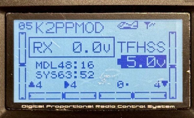 So if you have the same problem, this is how you fix it. There’s one little thing to adjust, plus a BIG thing to fix. Let’s do the little one first. On your main menu of the T6 and T10 it says FUTABA in big letters – see it above? Well, that is where you want the onboard receiver battery voltage to be displayed. Go to the PARAMETER/PRMTR menu and use the manual (easy) to change that field. It can be a few things but choose “telemetry”. You’ll manage that easily, but if you are same as me, you’ll still see no data.