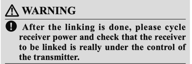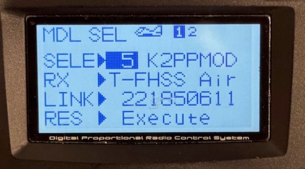 On my Futaba T10, that field was “XXXXXXXX”. It needs to say the serial number of the Receiver you are using. Use the JOG key to toggle down to the LINK field and try to change it – I think by holding the JOG key down. The menu suddenly tells you to unplug the battery and plug it back in. You get 20 seconds of bleeping to complete the operation. Do that and you should be in business.