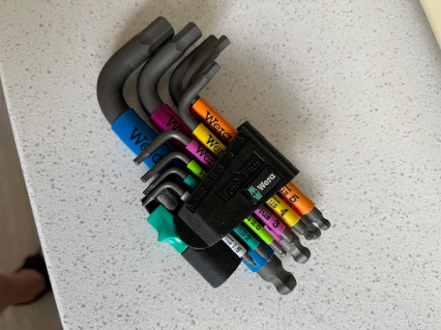 GH was careful to tell me to be very wary of over-tightening the bolt. I’ve been using simple hex keys left over from my cycling club days – nice ones with those round “any angle” ends on them. On the wide side, there’s about a 75mm throw so maybe the available leverage is a bit high. (See photo above). Too easy to over-tighten.
